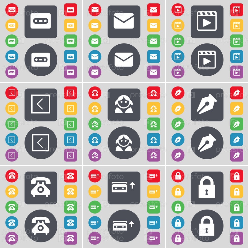 Кассета, сообщение, медиа-плеер, стрелка света, аватар, чернила перо, ретро телефон, кассеты, символ икон замка. большой набор плоских цветных кнопок для вашего дизайна. вектор