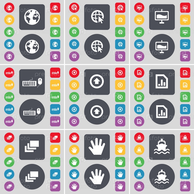 Земля, веб курсора, граф, клавиатура, стрелка вверх, файл схемы, галерея, рука, корабль значок символа. Большой набор плоских, цветные кнопки для вашего дизайна. Вектор