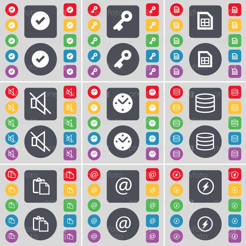 Тик, ключ, список, молчание, часы, базы данных, опросы, почта, флэш-иконка символа. большой набор плоских цветных кнопок для вашего дизайна. вектор
