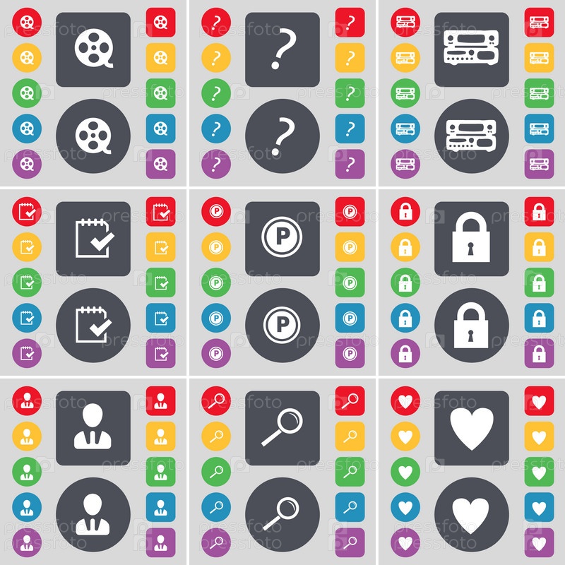 Видеозапись, вопросительный знак, -проигрыватель, обследования, парковка, замок, аватар, увеличительное стекло, сердце значок символа. Большой набор плоских, цветные кнопки для вашего дизайна. Вектор