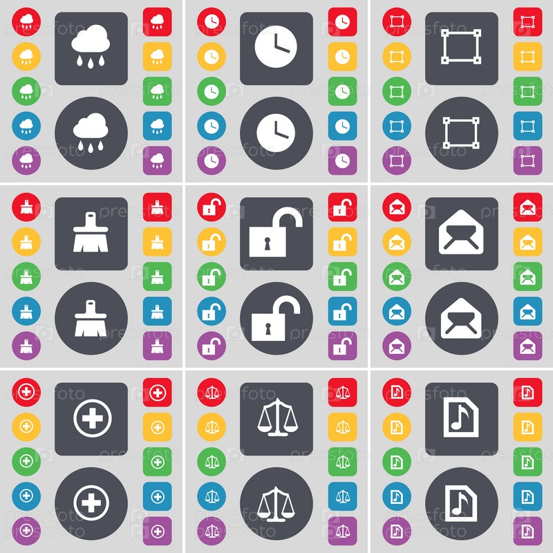 Облако, часы, рамки, кисти, замок, сообщение, плюс, весы, музыка файла значок символа. Большой набор плоских, цветные кнопки для вашего дизайна. Вектор
