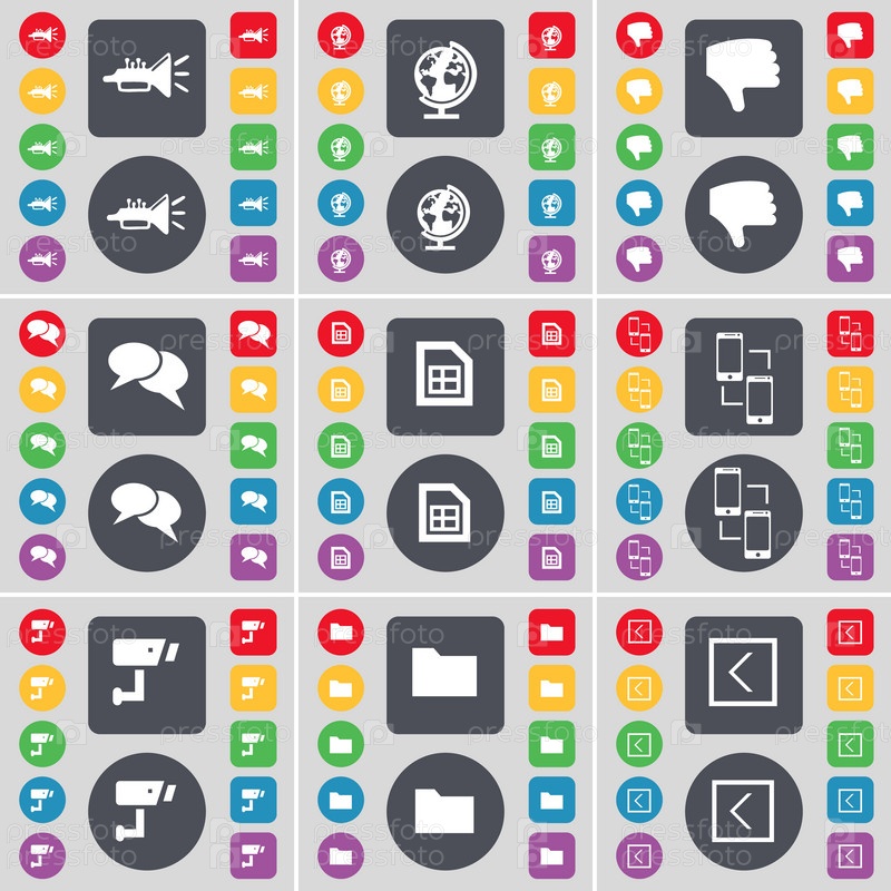 Отменить, глобус, вражда, чат, файл, связь, видеонаблюдение, папка, стрелка слева от значка символа. большой набор плоских цветных кнопок для вашего дизайна. вектор