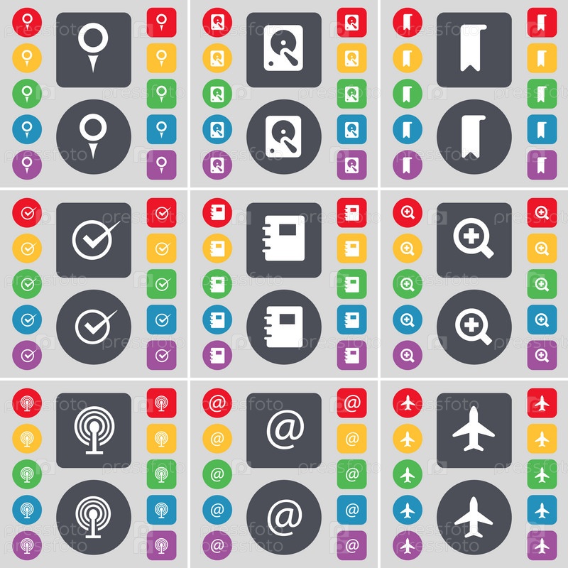 Контрольно-пропускная точка, жесткий диск, маркер, тик, ноутбук, лупа, Wi-Fi, почта, символ значка самолета. Большой набор плоских цветных кнопок для вашего дизайна. вектор
