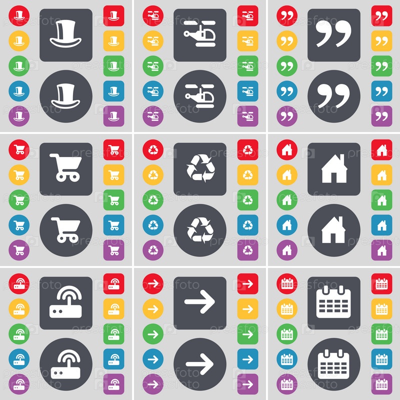 Цилиндр, вертолет, кавычки, корзина, переработка, дом, маршрутизатор, стрелка вправо, календарь значок символа. Большой набор плоских, цветные кнопки для вашего дизайна. Вектор