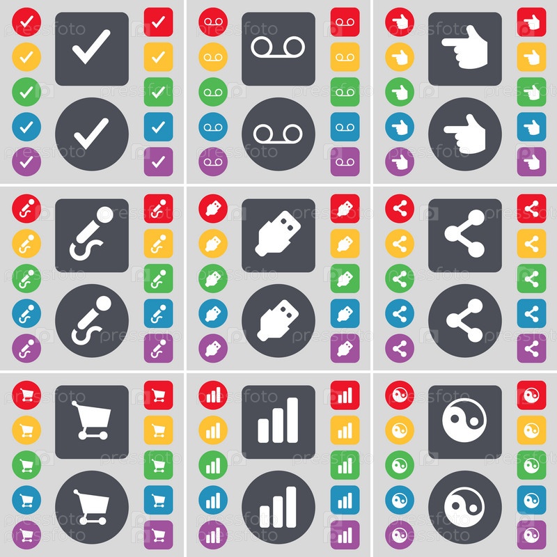 Клещ, кассеты, рука, микрофон, USB-накопитель, доля, торговая тележка, диаграмма, символ Инь-Ян иконка. большой набор плоских цветных кнопок для вашего дизайна. вектор