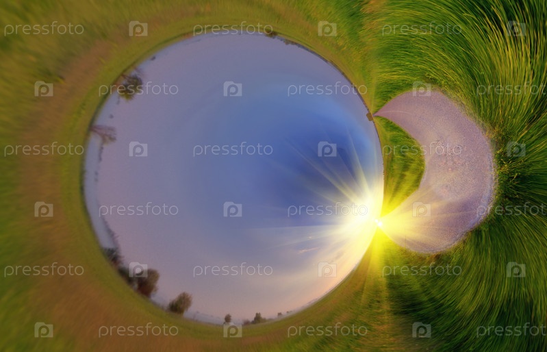 Панорамное изображение выглядит как Зеленая планета с восходом солнца над асфальтовая дорога