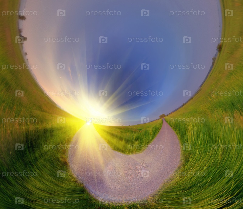 Дорога на поле на восходе солнца. Витой панорамное изображение