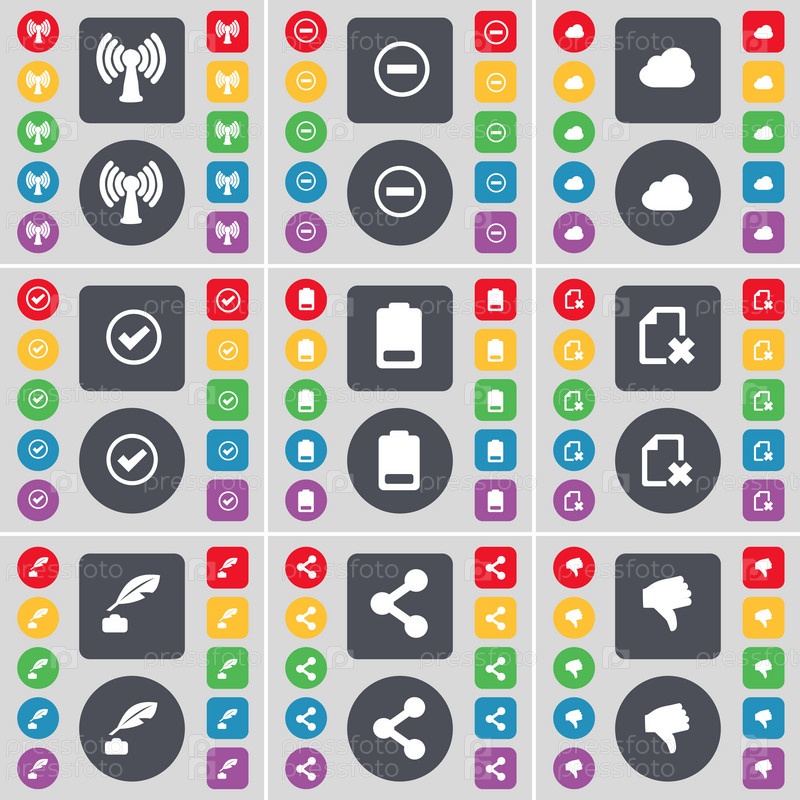 Wi-Fi, минус, облако, тик, батарея, файл, чернильный горшок, доля, символ значка неприязни. Большой набор плоских цветных кнопок для вашего дизайна. вектор