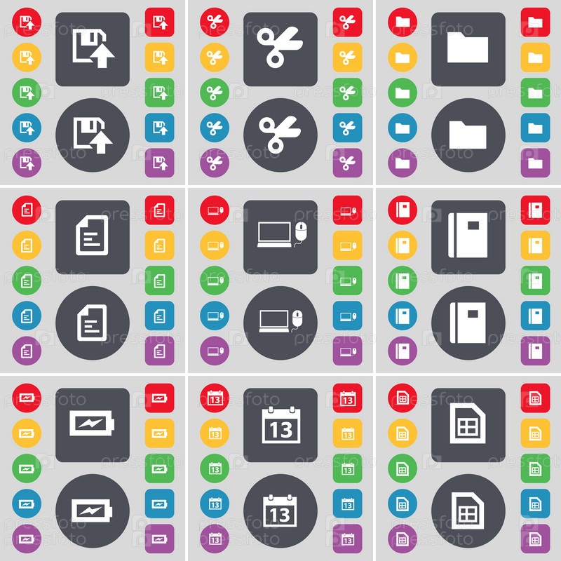 Флоппи, ножницы, папка, текст файла, ноутбук, ноутбук, зарядка, календарь, символ файл значка. Большой набор плоских, цветные кнопки для вашего дизайна. Вектор