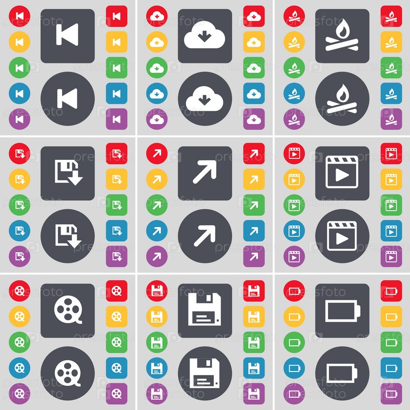 Средства массовой информации показывать, облако, костра, флоппи, полный экран, проигрыватель, видеокассеты, дискеты, значок символ батареи. Большой набор плоских, цветные кнопки для вашего дизайна. Вектор