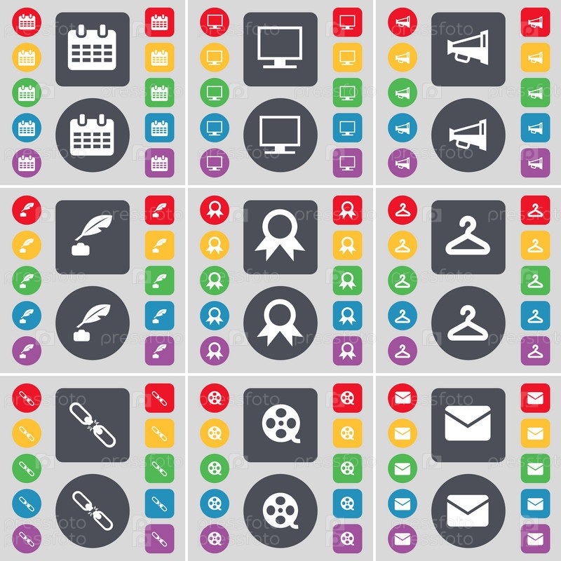 Календарь, монитор, Мегафон, чернильница, медаль, вешалка, ссылка, видеозапись, символ значок сообщения. Большой набор плоских, цветные кнопки для вашего дизайна. Вектор