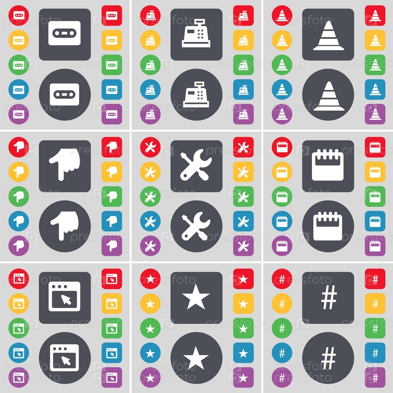 Кассета, кассовый аппарат, конус, рука, гайковерт, кассеты, окна, звезда, Hashtag значок символа. Большой набор плоских цветных кнопок для вашего дизайна. вектор