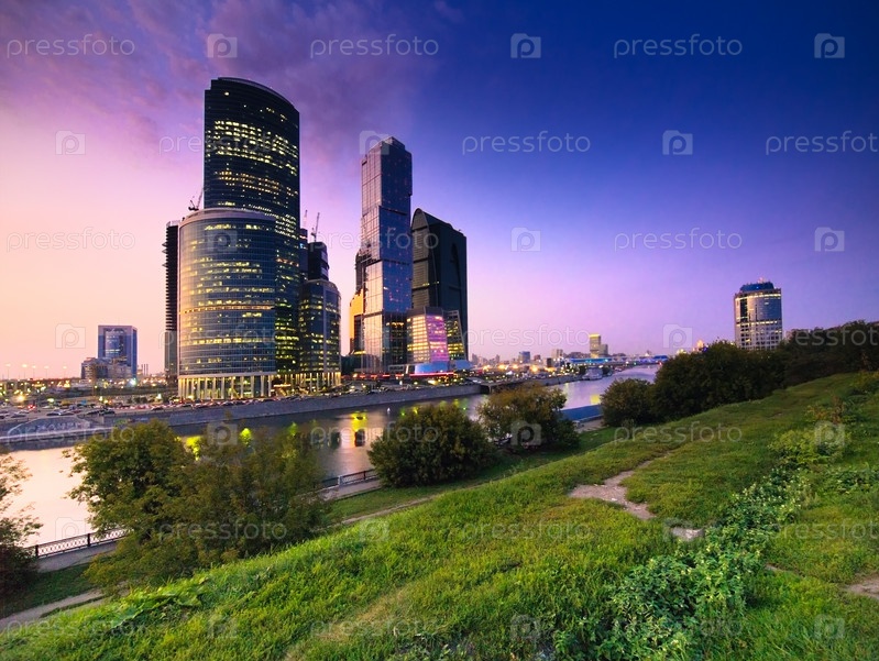 Современные небоскребы парк на закате. Москва. Россия