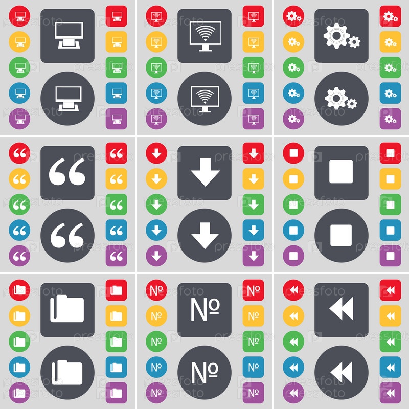 Монитор, снаряжение, кавычки, стрелка вниз, СМИ стоп, папки, номер, перемотка значок символа. Большой набор плоских, цветные кнопки для вашего дизайна. Вектор