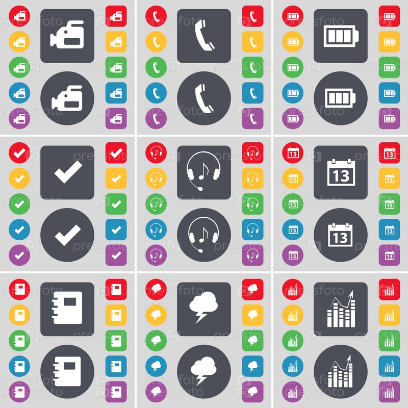 Фильм камеры, приемник, батарея, тик, наушники, календарь, ноутбук, молния, граф значок символа. Большой набор плоских, цветные кнопки для вашего дизайна. Вектор