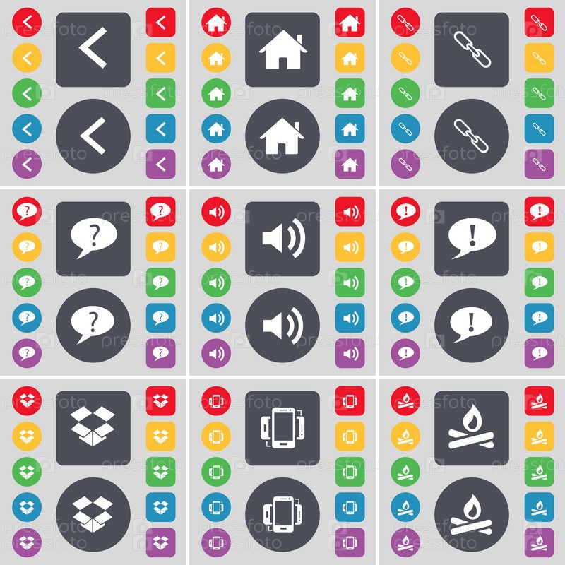 Стрелка слева, дом, ссылка, пузырь чата, звук, Dropbox, смартфон, значок символа костра. большой набор плоских цветных кнопок для вашего дизайна. вектор