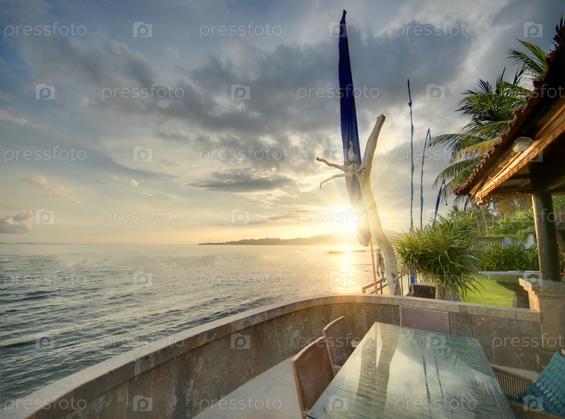 Красивый закат на балийском побережье с Ресторан