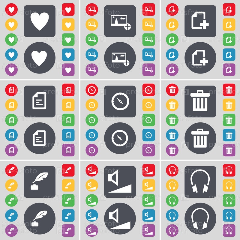 Сердце, изображение, файл, текстовый файл, компас, мусор может чернил горшка, объем, наушники значок символа. Большой набор плоских, цветные кнопки для вашего дизайна. Вектор