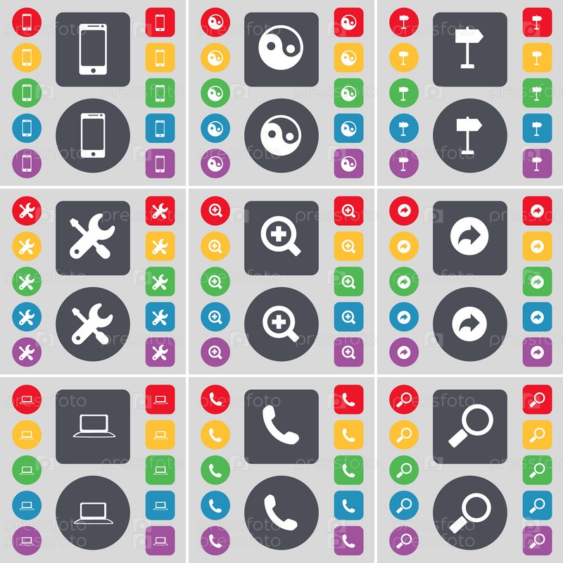 Смартфон, олово-Ян, указатель, Wrech, увеличительное стекло, обратный ход, ноутбук, приемник, символический значок икон. Большой набор плоских цветных кнопок для вашего дизайна. вектор