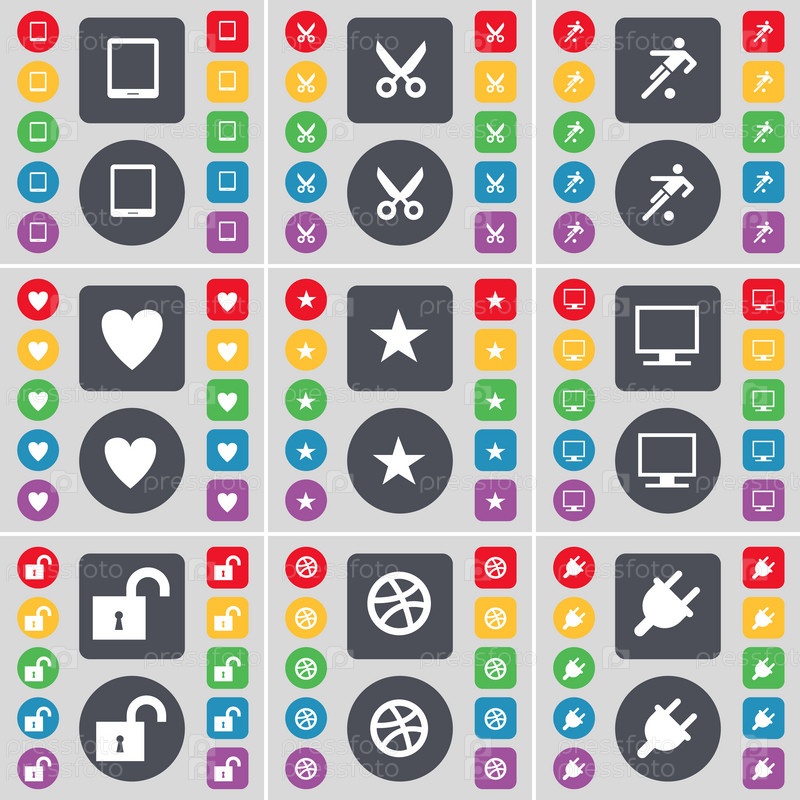 Представлены ПК, ножницы, футбол, сердце, звезда, монитор, замок, мяч, значок символа Socket.Большой набор плоских цветных кнопок для вашего дизайна.Вектор