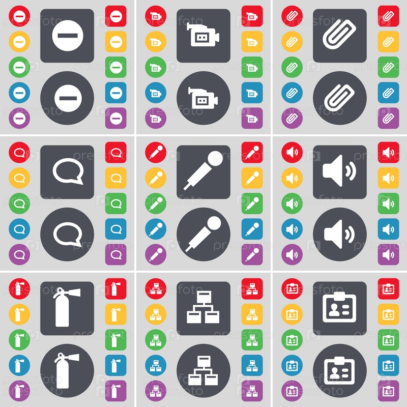 Минус фильм камеры, клип, звук пузырь, микрофон, чат, огонь огнетушителей, сети, контакт значок символа. Большой набор плоских, цветные кнопки для вашего дизайна. Вектор