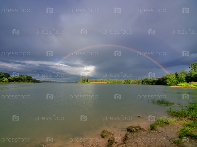 Летний пейзаж с двумя Радуга над озером. Рузское озеро в России