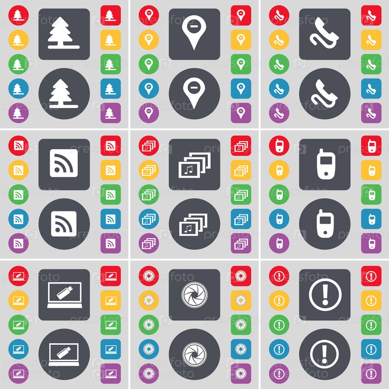 Дерево, контрольно-пропускной пункт, приемник, RSS, галерея, мобильный телефон, ноутбук, объектив, предупреждение значок символа. большой набор плоских цветных кнопок для вашего дизайна. вектор