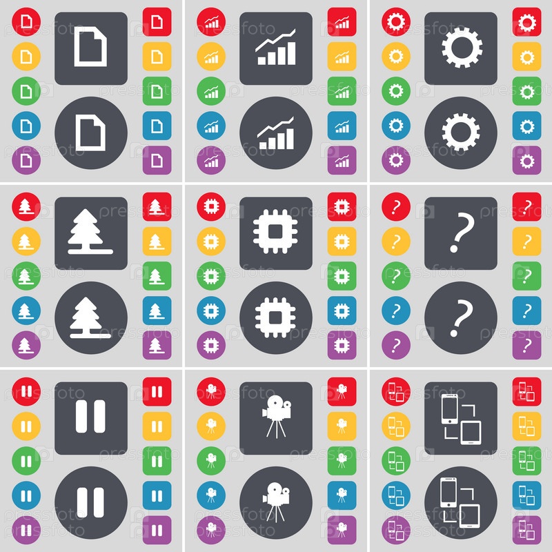 Файл, граф, снаряжение, елочка, процессор, вопросительный знак, пауза, пленочной камеры, символ значок подключения. Большой набор плоских, цветные кнопки для вашего дизайна. Вектор