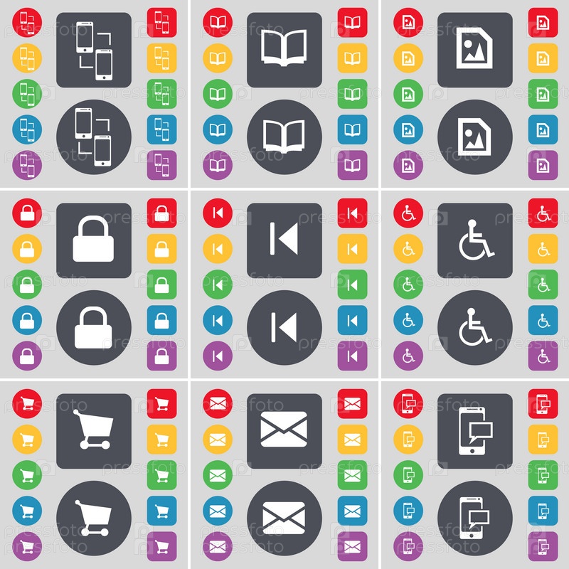 Смартфон, книга, медиа-файл, блокировка, пропустить, инвалид, корзина покупок, сообщения, значок символа SMS. Большой набор плоских цветных кнопок для вашего дизайна. вектор