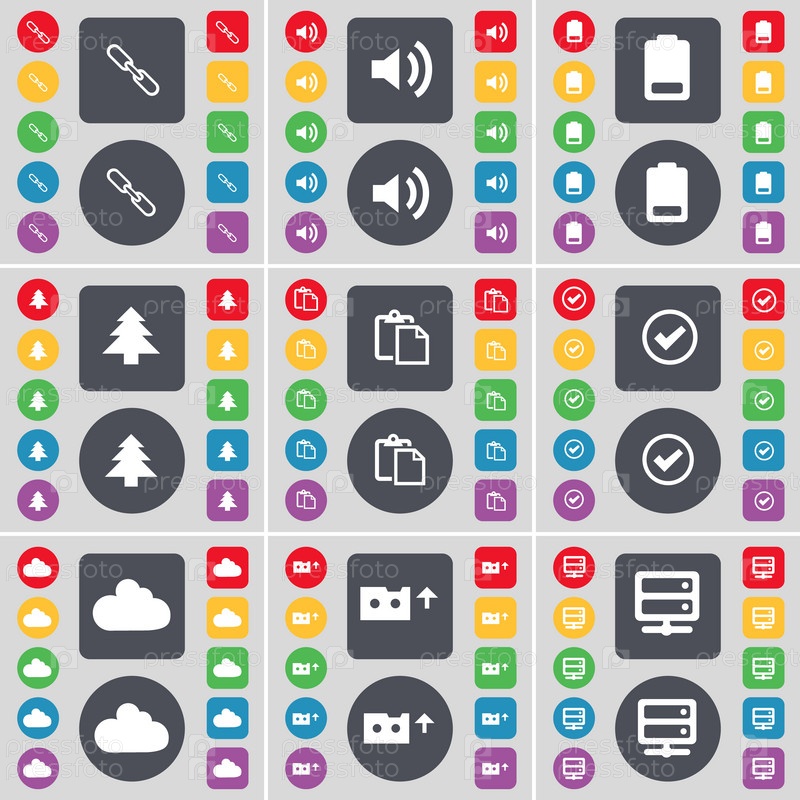 Связь, звук, батарея, елочка, обследования, тик, облако, кассета, символ значок сервера. Большой набор плоских, цветные кнопки для вашего дизайна. Вектор