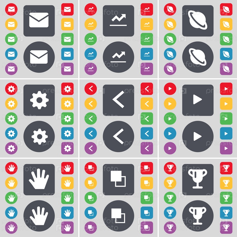 Сообщение, граф, планета, редуктор, стрелка слева, игра в СМИ, рука, копирование, кубок значка символа. большой набор плоских цветных кнопок для вашего дизайна. вектор