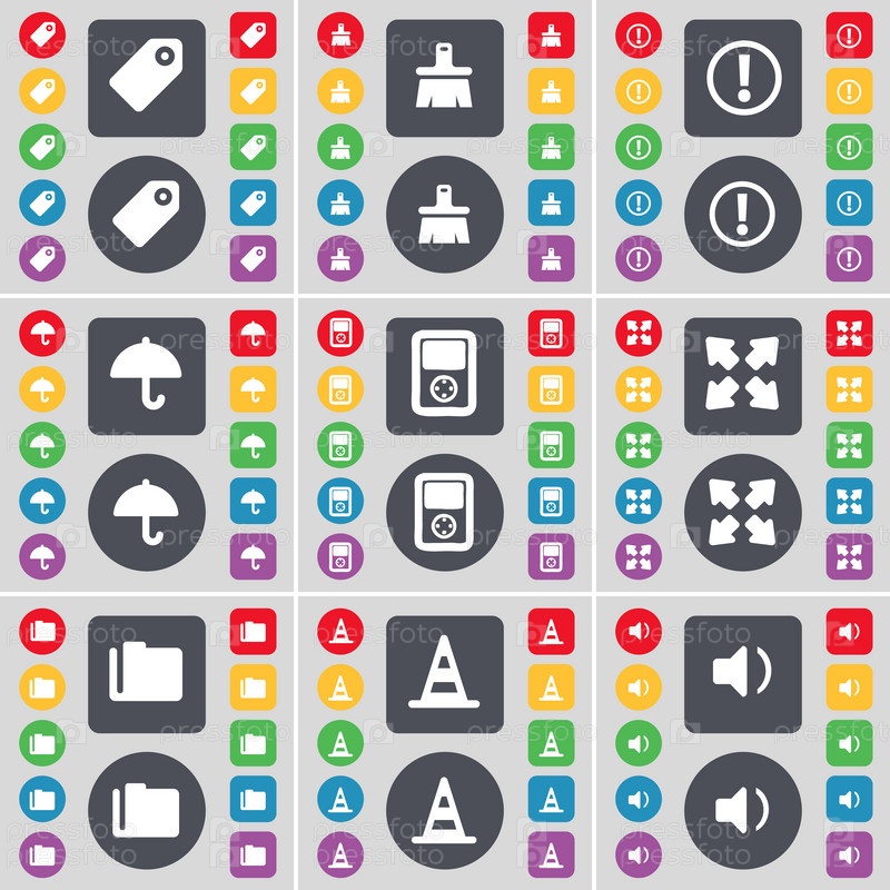 Тег, кисти, предупреждение, зонтик, игрок, полный экран, папка, конуса, символ значок звука. Большой набор плоских, цветные кнопки для вашего дизайна. Вектор