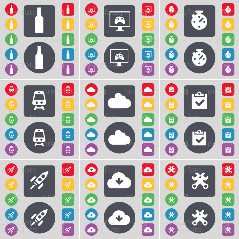 Бутылка, монитор, секундомер, поезд, облако, обследования, ракета, облако, символ значок гаечного ключа. Большой набор плоских, цветные кнопки для вашего дизайна. Вектор