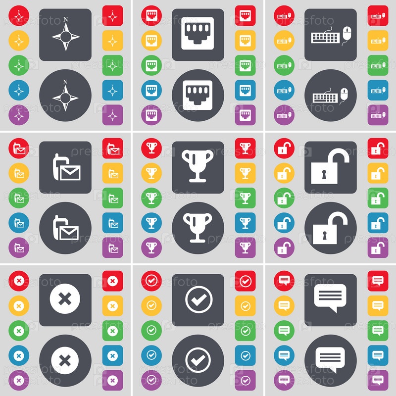Компас, лан-сокет, клавиатура, SMS, чашка, замок, стоп, тик, чат пузырь значок символа. большой набор плоских цветных кнопок для вашего дизайна. вектор