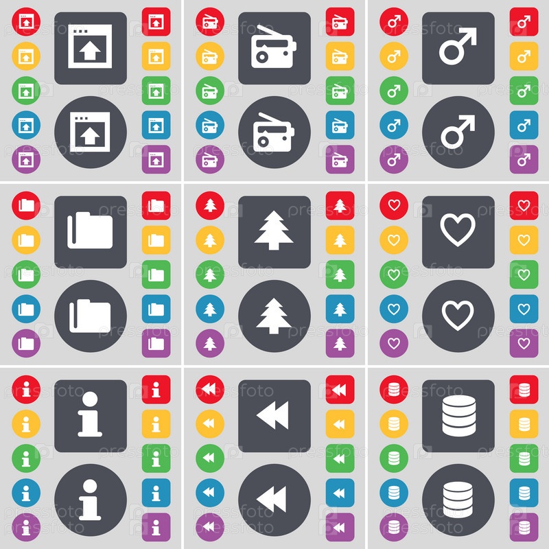 Символ окна, Радио, Марс, папка, елочка, сердце, информация, перемотка, базы данных значок символа. Большой набор плоских, цветные кнопки для вашего дизайна. Вектор