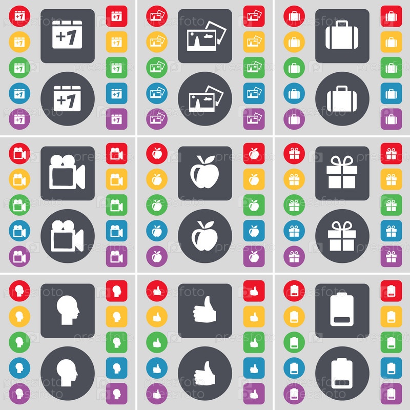 Плюс один, картинка, чемодан, пленочной камеры, яблоко, подарок, силуэт, как символ значок батареи. Большой набор плоских, цветные кнопки для вашего дизайна. Вектор