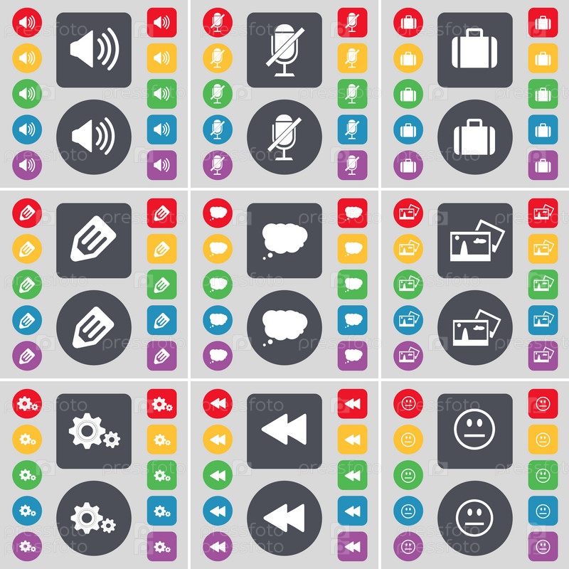 Звук, чемодан, карандаш, микрофон, облако чата, картинка, редуктор, перевернуть, улыбка значок символа. большой набор плоских цветных кнопок для вашего дизайна. вектор