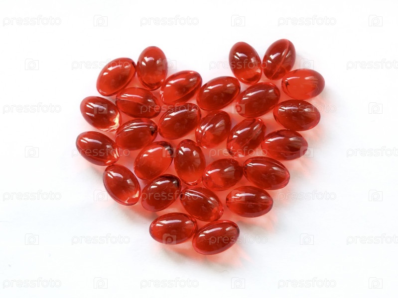 Красные капсулы таблетки в форме сердца на белом фоне