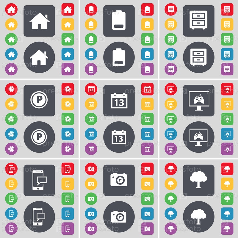 Дом, аккумулятор, постельный стол, парковка, календарь, монитор, SMS-сообщение, календарь, символ иконы дерева.Большой набор плоских цветных кнопок для вашего дизайна.Вектор