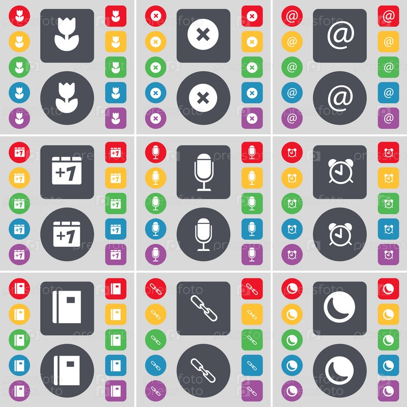 Цветок, стоп, почта, плюс один, микрофон, Будильник, ноутбук, ссылка, Луна значок символа. Большой набор плоских, цветные кнопки для вашего дизайна. Вектор