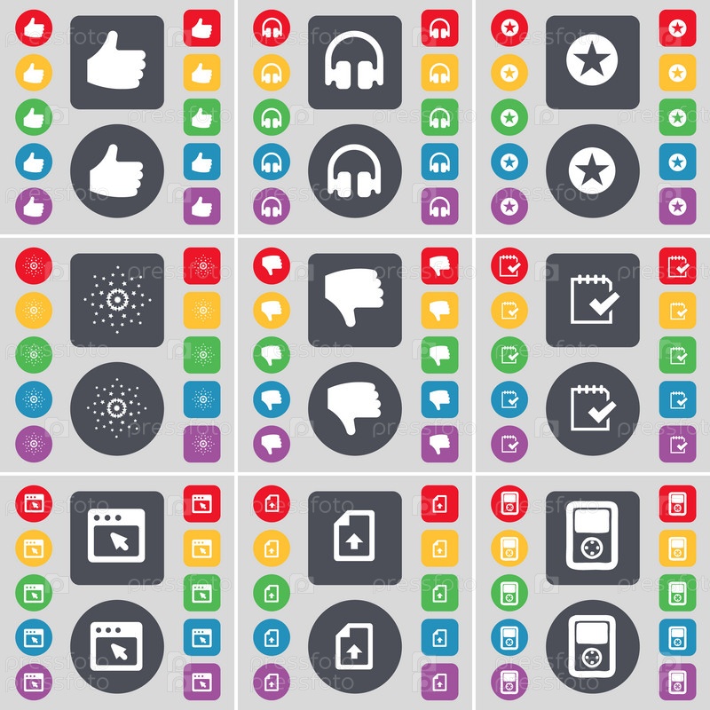 Как, наушники, звезда, неприязнь, обследования, окно, загрузить файл, значок символ игрока. Большой набор плоских, цветные кнопки для вашего дизайна. Вектор