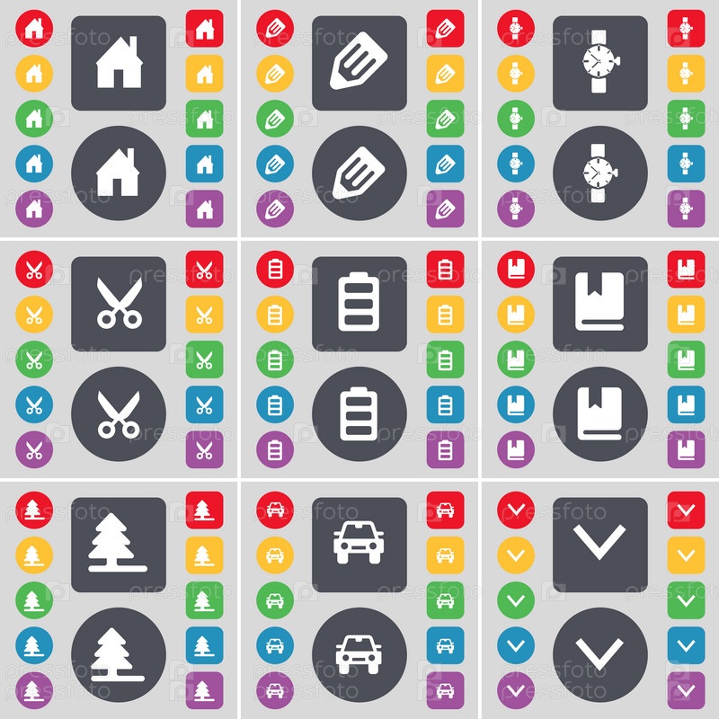 Дом, карандаш, наручные часы, ножницы, батарея, словарь, елочка, автомобиль, стрелка вниз значок символа. Большой набор плоских, цветные кнопки для вашего дизайна. Вектор