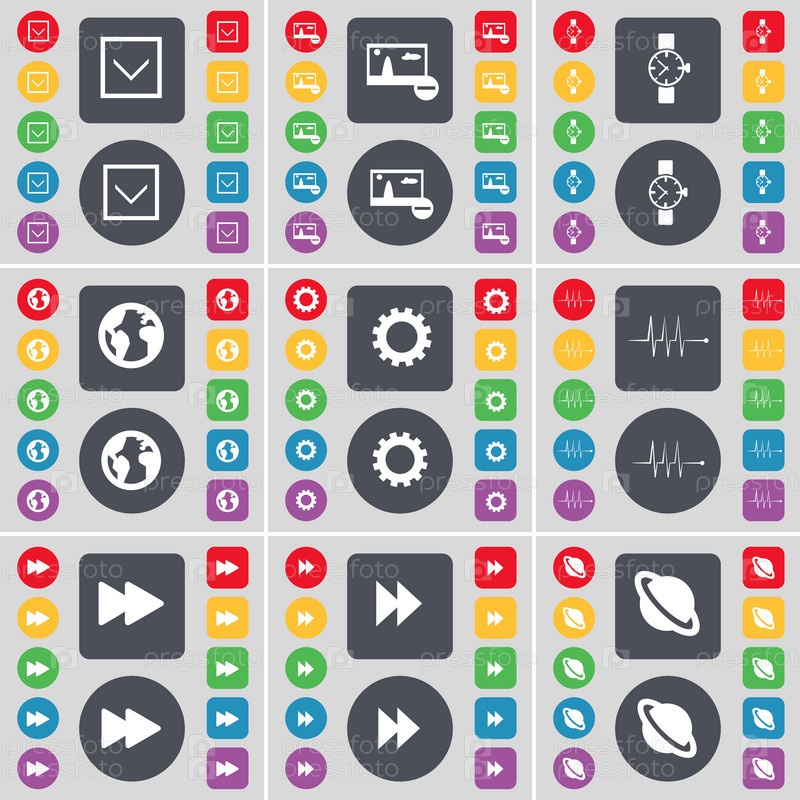 Стрелка вниз, фотография, наручные часы, земля, оборудование, пульс, Rewind, Планета значок символа. большой набор плоских цветных кнопок для вашего дизайна. вектор