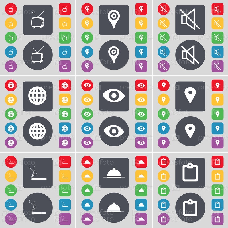 Ретро-ТВ, контрольно-пропускной пункт, Mute, глобус, видение, сигареты, лоток, обследование значок символа. большой набор плоских цветных кнопок для вашего дизайна. вектор