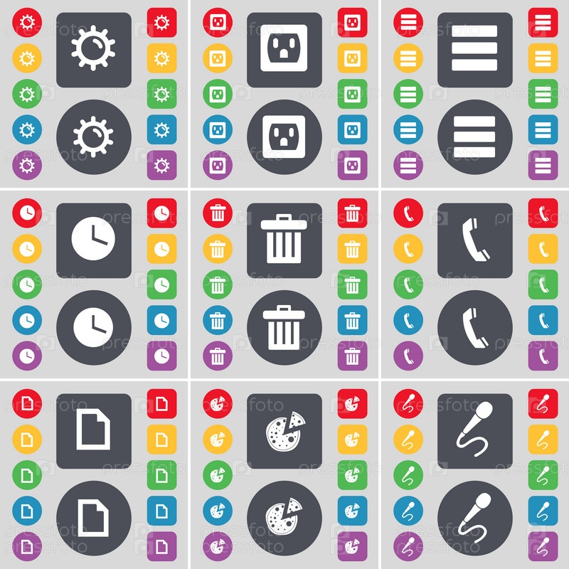 Гир, гнездо, приложения, часы, мусорный бак, приемник, файл, пицца, символ значка микрофона. большой набор плоских цветных кнопок для вашего дизайна. вектор