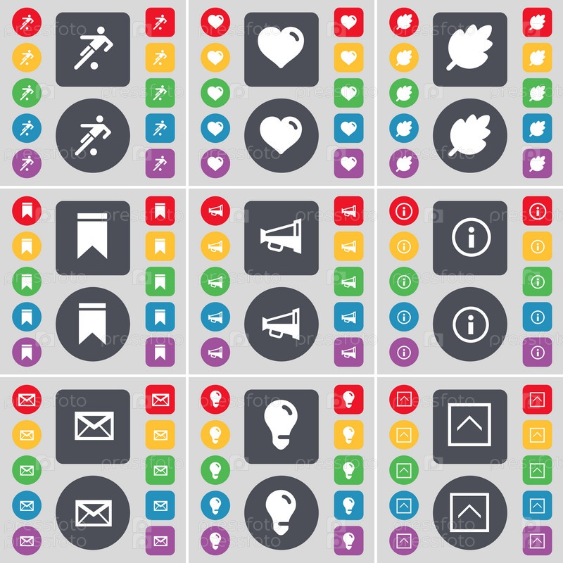 Силуэт, сердце, лист, маркер, Мегафон, информация, сообщение, лампочки, стрелка вверх значок символа. Большой набор плоских, цветные кнопки для вашего дизайна. Вектор