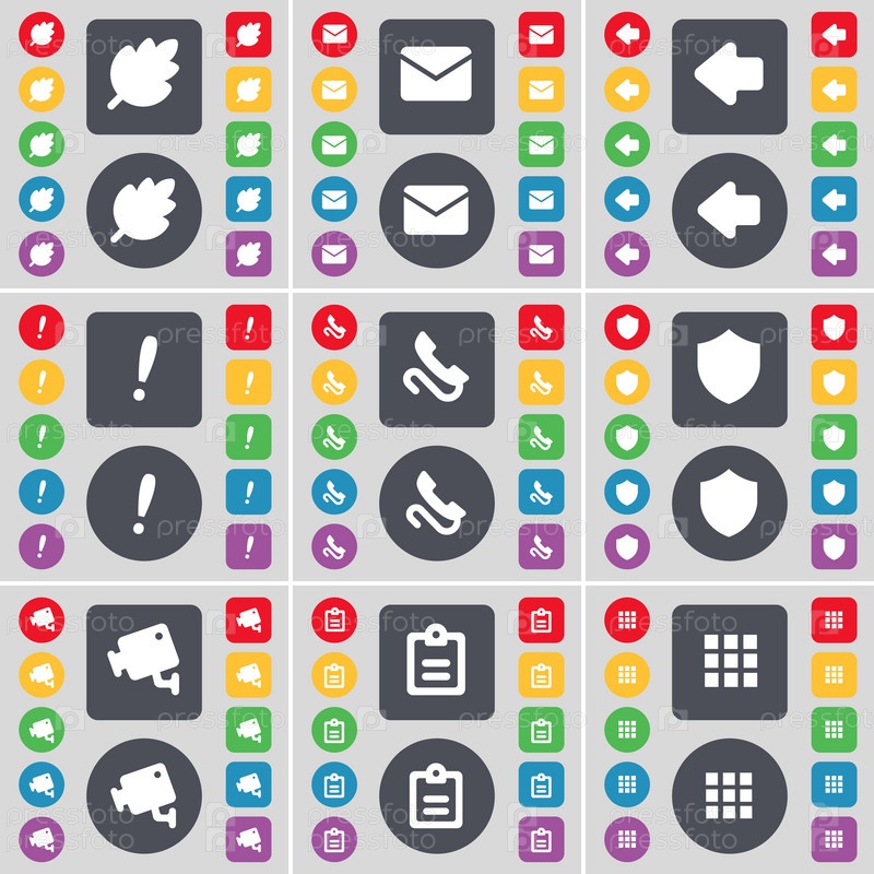 Лист, сообщение, стрелка слева, восклицательный знак, значок, CCTV, исследования, символ иконки приложения.Большой набор плоских цветных кнопок для вашего дизайна.Вектор