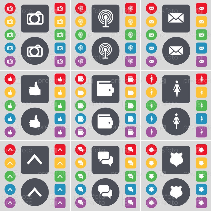 Камера, Wi-Fi, сообщение как кошелек, силуэт, стрелка вверх, чат, полицейский значок символа. большой набор плоских цветных кнопок для вашего дизайна. вектор