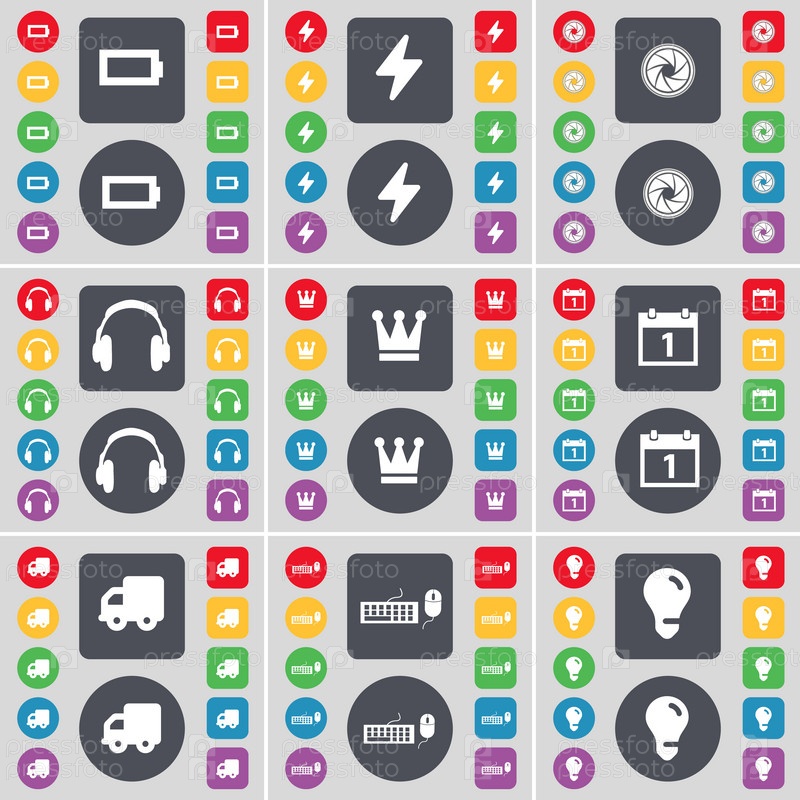 Аккумулятор, Флэш, объектив, наушники, Корона, календарь, грузовик, клавиатура, значок символа света лампы. Большой набор плоских цветных кнопок для вашего дизайна. вектор