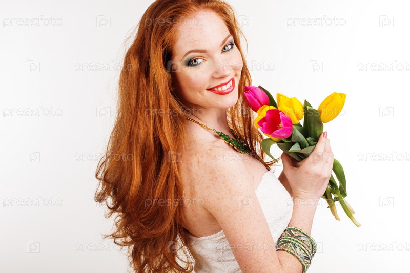 Красивая рыжеволосая девушка держит тюльпаны, изолированные на белом фоне
